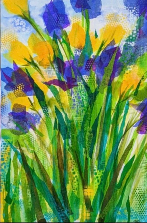 Bring Spring into your home anytime with this beautiful abstract painting/collage of a patch of Iris's